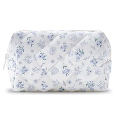 50.0% Off[BACDOILQ] BACDOILQ Quilted Makeup Bag, Cute Floral Cotton Cosmetic Bag, Blue Flowers Coquette Makeup Pouch for Women Girls, Aesthetic Organizer Bags Travel Toiletry Bags