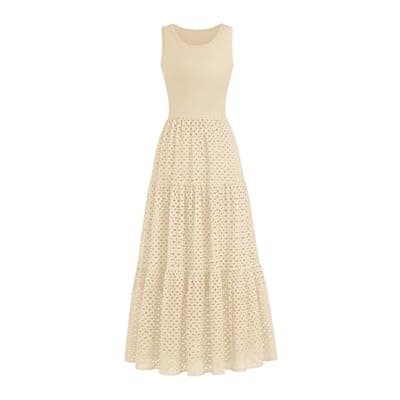 [Lazysmile] Lazysmile Womens Summer Dresses Crewneck Sleeveless A-Line Hollow Out Eyelet Tiered Tank Maxi Dress Sundress with Pockets