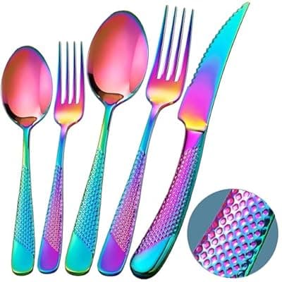 50.0% Off[Runfly] Runfly 20 Piece Hammered Rainbow Silverware Set, 18/10 Stainless Steel Flatware Set, Modern Kitchen Utensil Set Service for 4, Tableware Set, Cutlery Set Including Fork Spoon and Knife