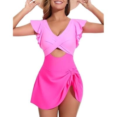 [MFAVIP] MFAVIP Women One Piece Swim Dress Tummy Control Swimsuits V Neck Ruffle Bathing Suit Cutout Sexy Wrap Side Tie with Skirt