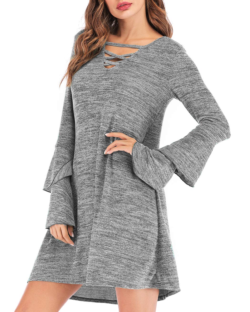 Eanklosco Women’s Sweater Dress Flare Long Sleeve Knit Jumper Tops Criss Cross V Neck Loose Swing Tunic Dress- Amazon.com